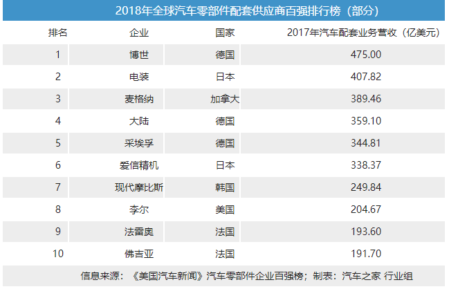 由于很多零部件企业2018年的财报并未公布,我们参考2018年全球汽车零部件企业百强榜单,该榜单根据各汽车零部件厂商2017年的汽车配套营收进行排名。在新的一年里全球排行前十的零部件巨头们都有什么样的新年计划呢?